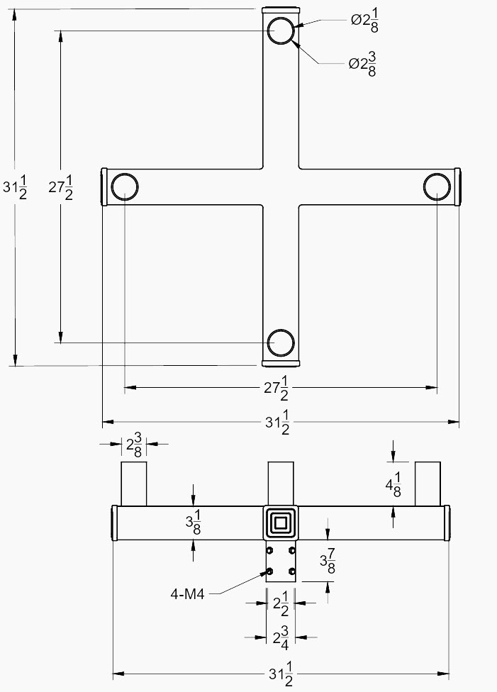 The steel bullhorn with 4 arms is engineered for 90° mounting. Mounts on a tennon. Fabricated from galvanized steel for enhanced corrosion resistance, it features a robust powder-coated dark bronze finish for durability and long-term performance in outdoor applications. The overall dimension is 64″.
