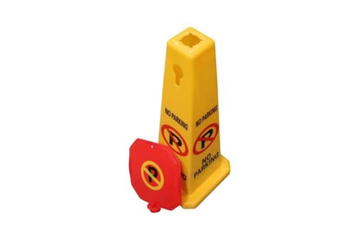 Four sided no parking floor cone with detachable no-parking top sign. Ideal for indoor and outdoor use and temporarily mark spaces and roadways with a No-Parking warning.