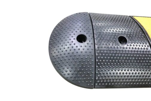 End cap for BLSB6RBNP, 6′ Speed Bump. Heavy-duty rubber installs by locking into the main piece. Secured by using anchor bolts to concrete or asphalt. Has one countersink hole to accommodate hardware. We suggest stainless steel or galvanized 6″ concrete anchors for permanent installation. McMaster or Hilti are the sources we recommend for the anchors.