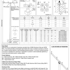 Height: 20 ft Gauge: 0.188″ Bottom OD: 7″ Bolt Circle: 10″ – 11″ Base Square: 10.5″ Bolt Projection: 2.75″ Anchor Bolts: 1″ x 36″ x 4″ Pole Shaft: Shaft and arm are constructed of a seamless extruded tube of 6063 Aluminum Alloy per ASTM B221. The shaft assembly is full-length heat treated after the base is welded to produce a T6 temper. The powder coating material is thermosetting polyester powder. A minimum coating thickness of 2.0 mils is maintained for aluminum. The application of powder is electrostatically applied by a closed-loop automated powder coating system. Finish Options: Dark Bronze, Black, Gray, White, and Satin Aluminum finish available. Please call for details. (888)364-8802 4-Bolt Cast Aluminum Base Plate:4-Bolt Cast Aluminum Base Flange of Alloy 356-T6 with Aluminum Bolt Covers (Alloy 356-F) and Stainless Steel Hex Head Attaching Screws. Hardware Kits: Include four (4)L-shaped Steel Anchor Bolts conforming to AASHTO M314-90 Grade 55. Ten Inches (10°) of the threaded end will be galvanized per ASTM A153. Kits will contain four (4) Hex Nuts, four (4) Lock Washers, and four(4) Flat Washers (all components Galvanized Steel). A bolt circle template will be provided. Fixture Mounting options: Designed for 4 LED fixtures with slip fitters