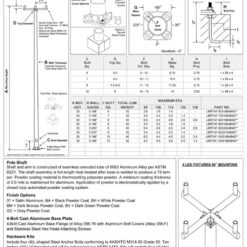 Height: 20 ft Gauge: 0.188″ Bottom OD: 8″ Bolt Circle: 11″ – 12″ Base Square: 11.25″ Bolt Projection: 2.75″ Anchor Bolts: 1″ x 36″ x 4″ Pole Shaft: Shaft and arm are constructed of a seamless extruded tube of 6063 Aluminum Alloy per ASTM B221. The shaft assembly is full-length heat treated after the base is welded to produce a T6 temper. The powder coating material is thermosetting polyester powder. A minimum coating thickness of 2.0 mils is maintained for aluminum. The application of powder is electrostatically applied by a closed-loop automated powder coating system. Finish Options: Dark Bronze, Black, Gray, White, and Satin Aluminum finish available. Please call for details. (888)364-8802 4-Bolt Cast Aluminum Base Plate:4-Bolt Cast Aluminum Base Flange of Alloy 356-T6 with Aluminum Bolt Covers (Alloy 356-F) and Stainless Steel Hex Head Attaching Screws. Hardware Kits: Include four (4)L-shaped Steel Anchor Bolts conforming to AASHTO M314-90 Grade 55. Ten Inches (10°) of the threaded end will be galvanized per ASTM A153. Kits will contain four (4) Hex Nuts, four (4) Lock Washers, and four(4) Flat Washers (all components Galvanized Steel). A bolt circle template will be provided. Fixture Mounting options: Designed for 4 LED fixtures with slip fitters