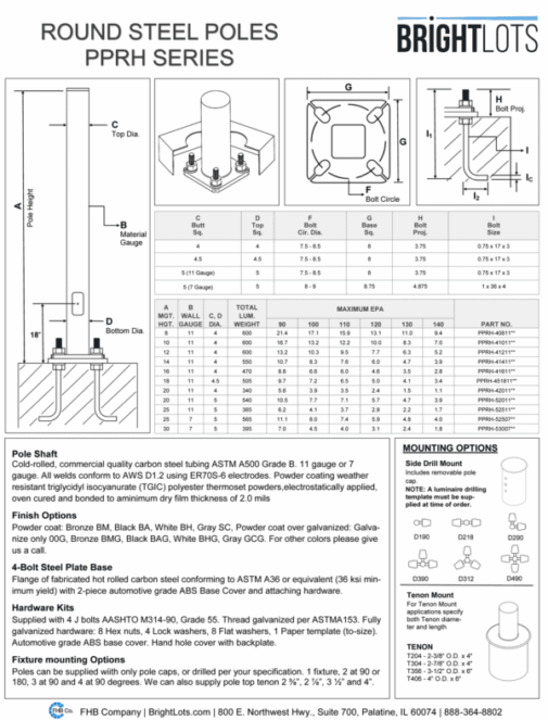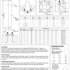 Pole:Cold-rolled, commercial-quality carbon steel tubing ASTM A500 Grade B. 11 gauge or 7 gauge. All welds conform to AWS D1.2 using ER70S-6 electrodes. Powder coating weather resistant triglycidyl isocyanurate (TGIC) polyester thermoset powders, electrostatically applied, oven cured and bonded to a minimum dry film thickness of 2.0 mils